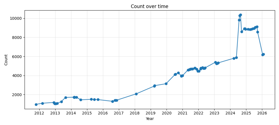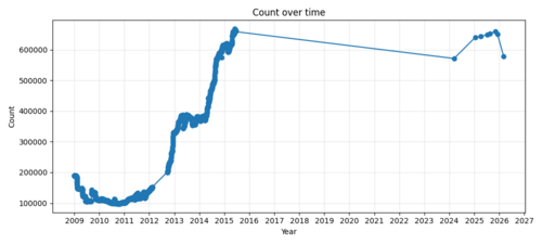 CfDs over time – this chart was made possible by generative AI and uses data of scraped from Wayback Machine archives of Category:Categories for discussion via a new tool